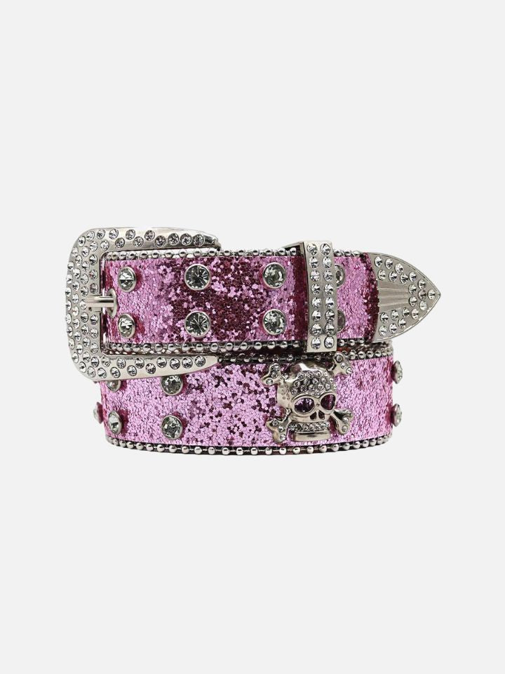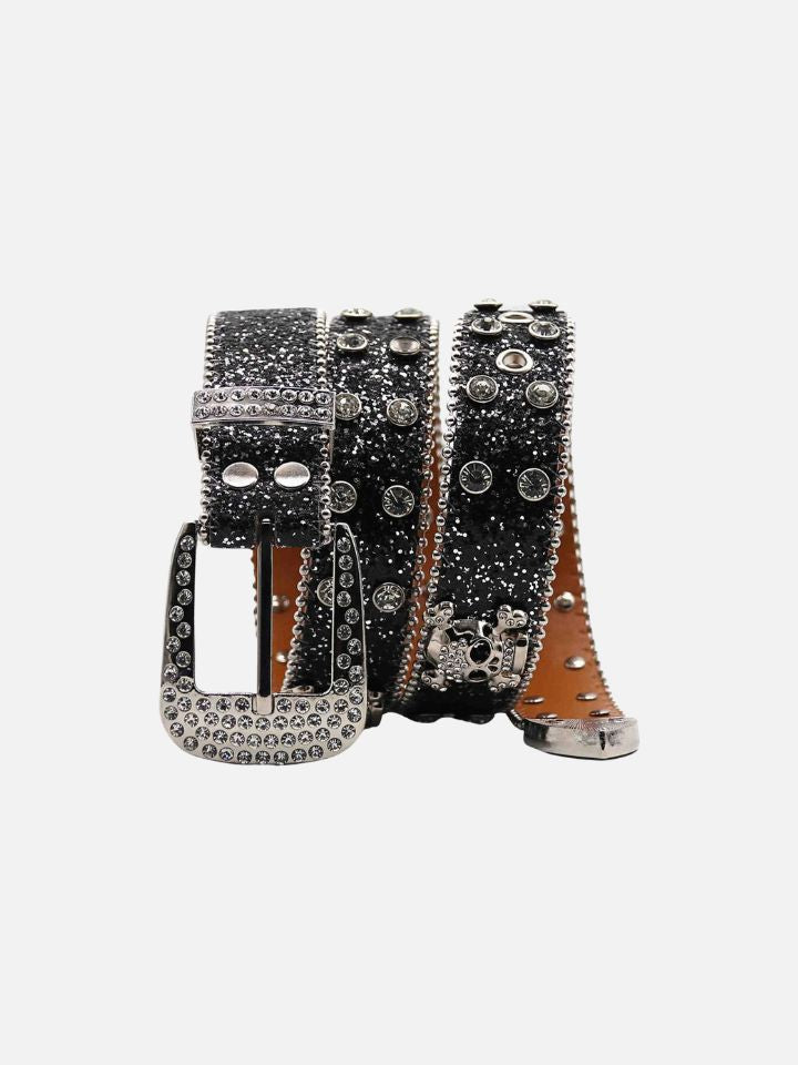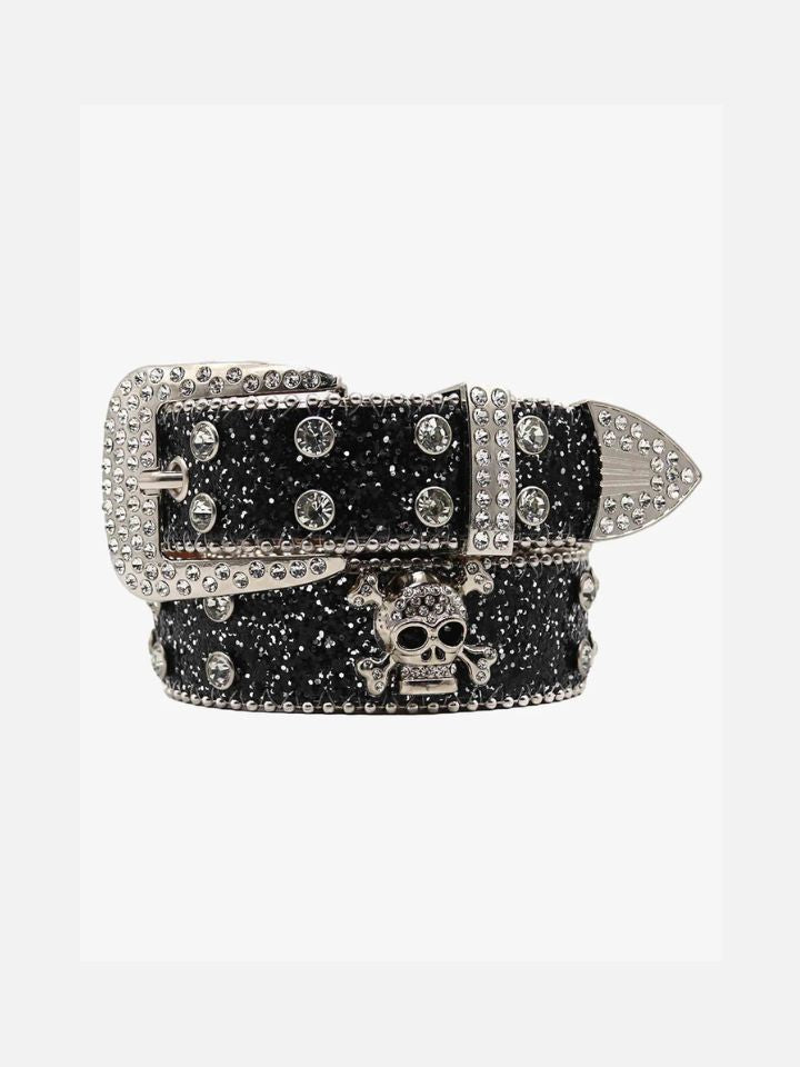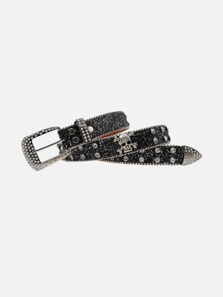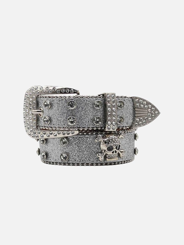 The Belt 'Silver Skullblast' is a silver-tone skull belt with an explosive star-burst element radiating from the main skull buckle. The hardware is oversized and committed.