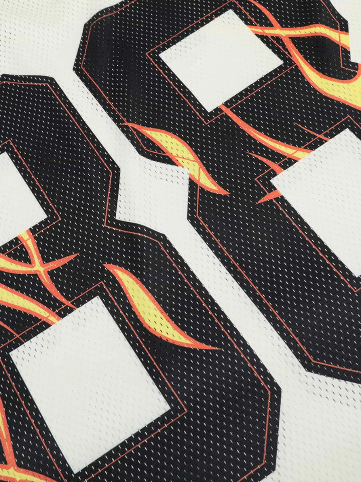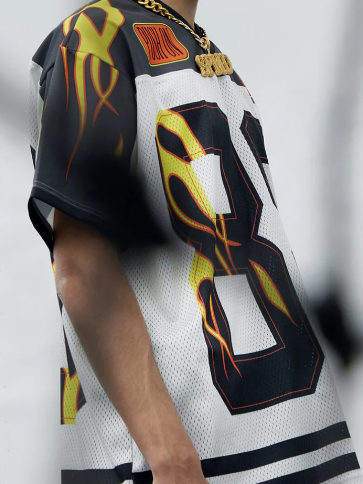 Blaze Flame Print: Bold fire graphic extending from chest to arm — the flame moves across the tee surface