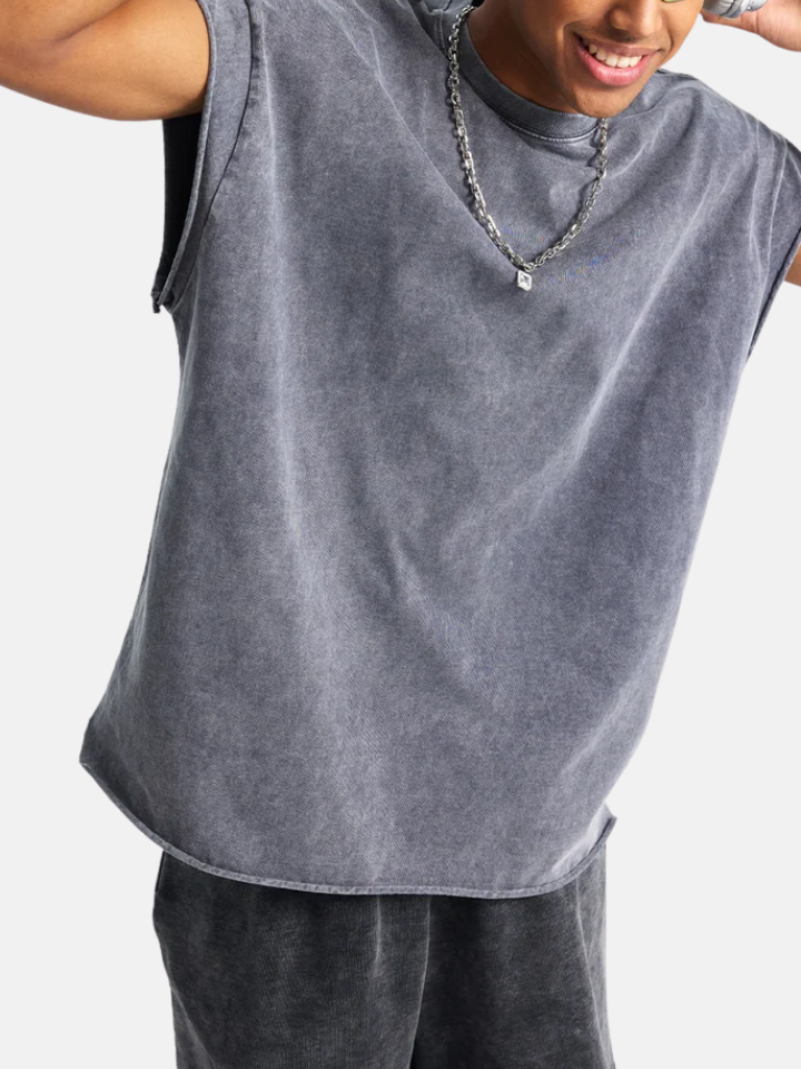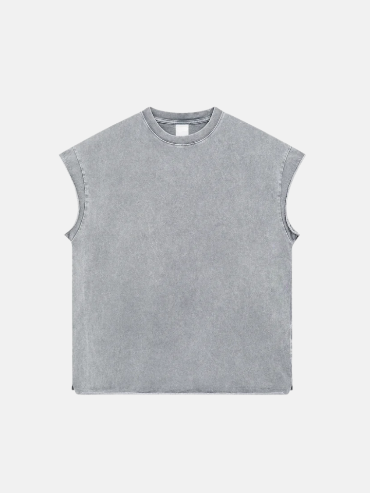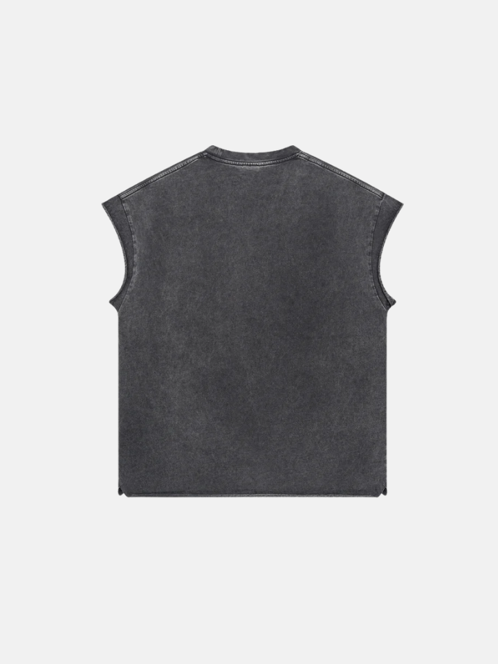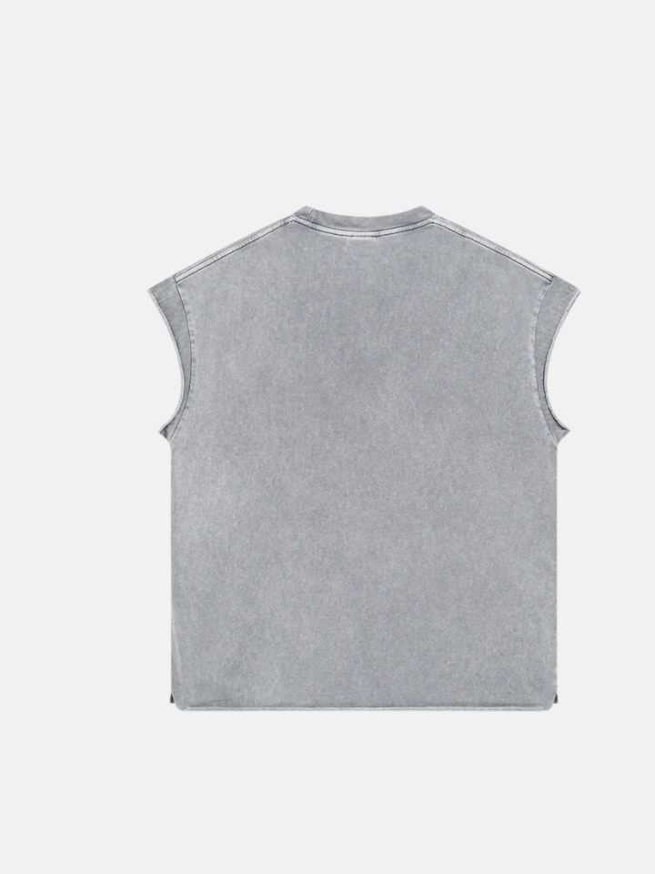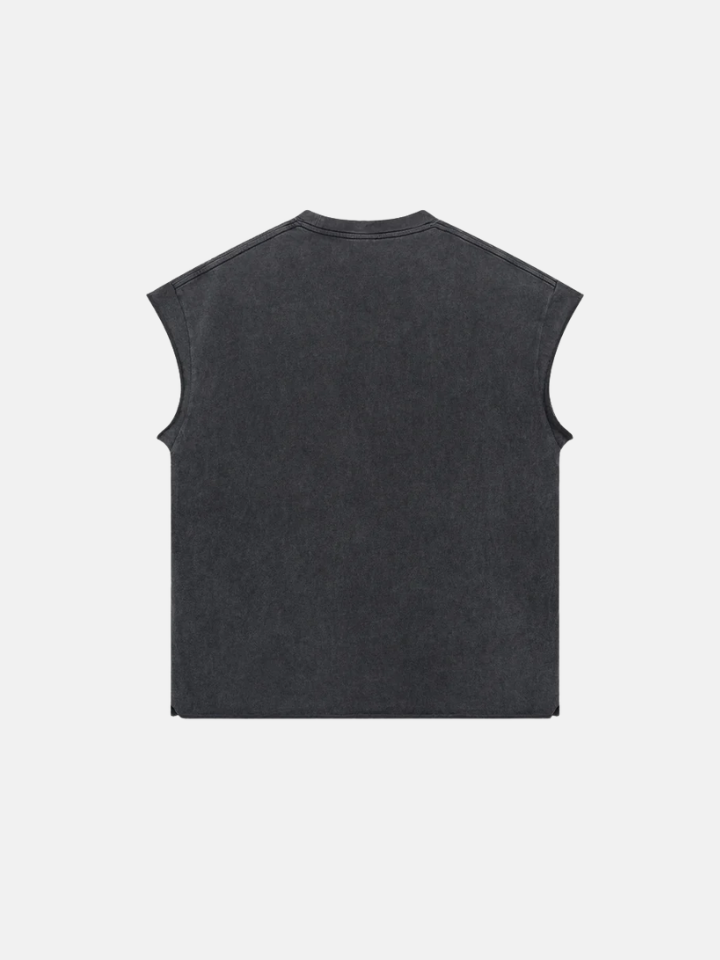 The Tank Top 'Station' is a station-destroyed tank — the distress pattern follows a path across the fabric like something moved through it, leaving a trail of breakdown that has direction.
