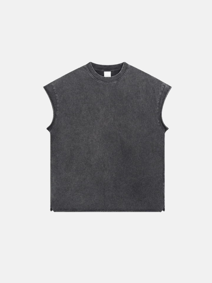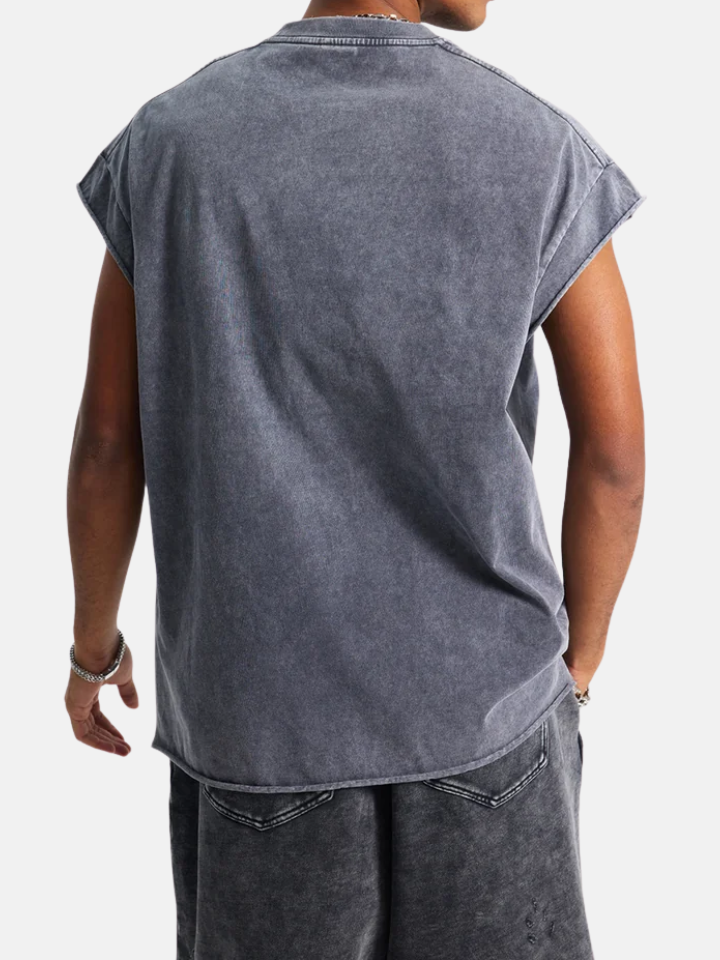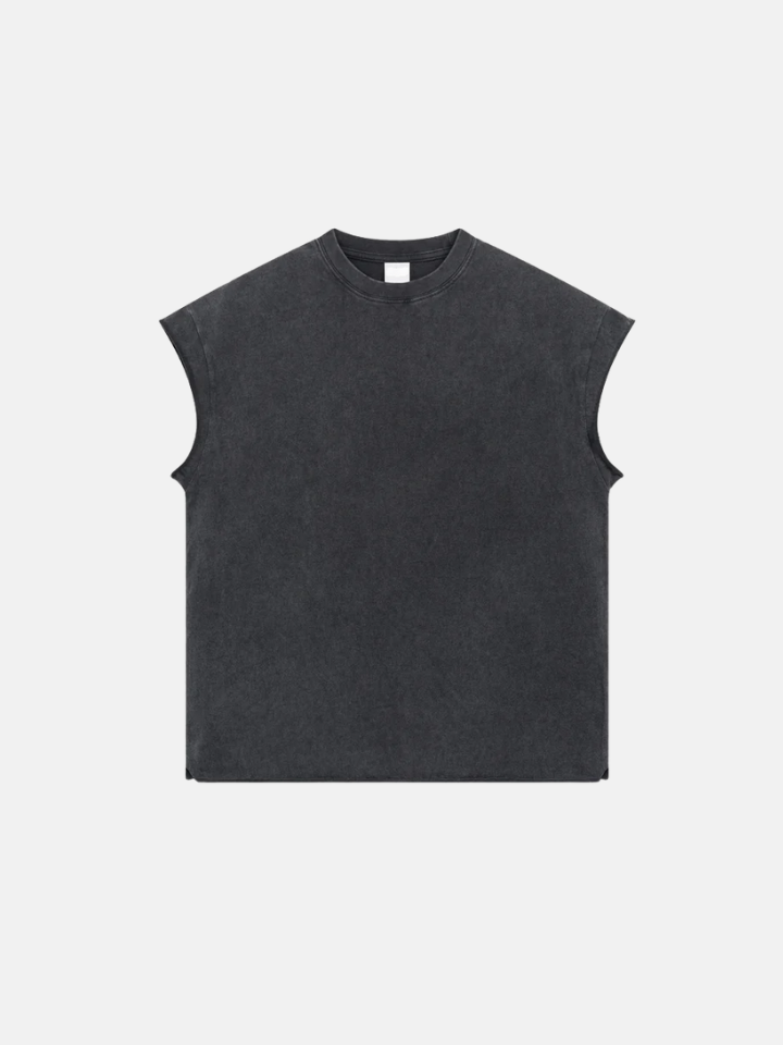 Fit: Relaxed with intentional raw edges at armhole and hem