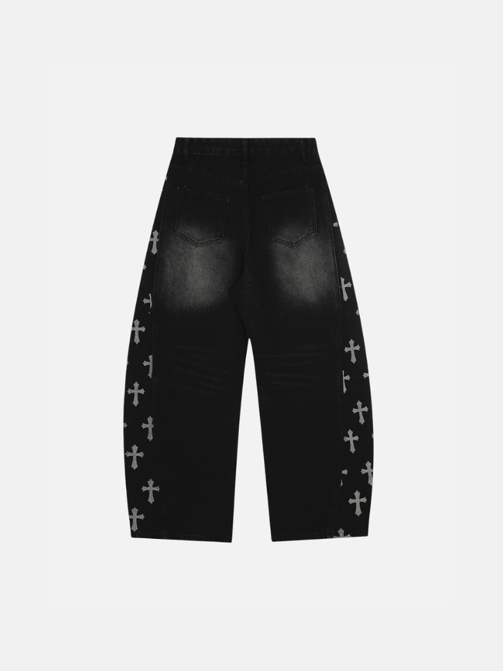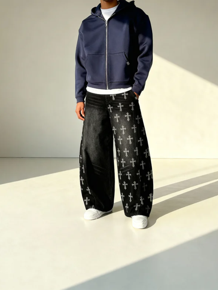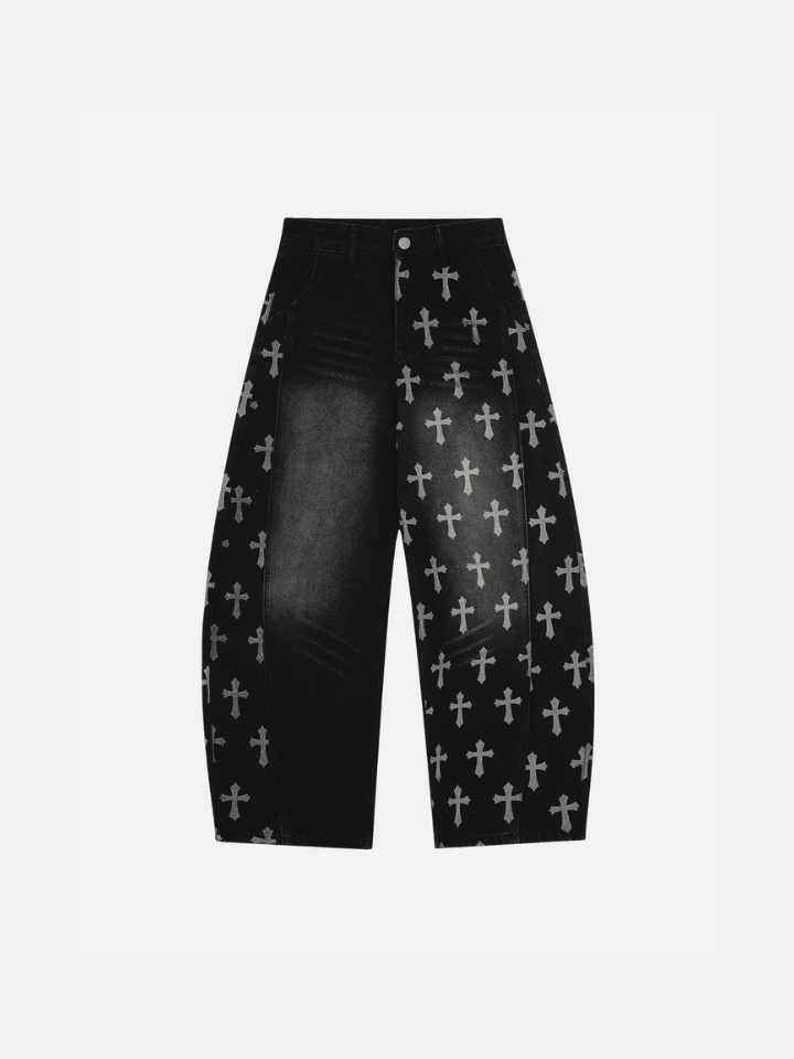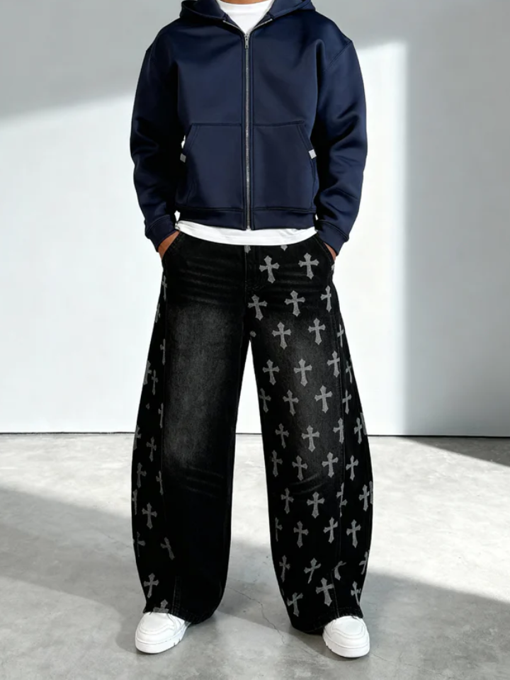 The Pants 'Hollowcrest' is a cross-motif baggy pants with the cross pattern integrated into the fabric surface — structural, symbolic, and committed to a specific visual language.