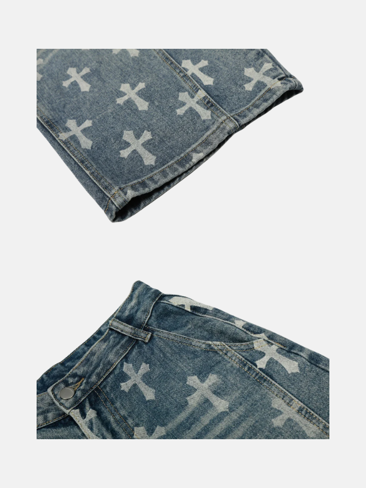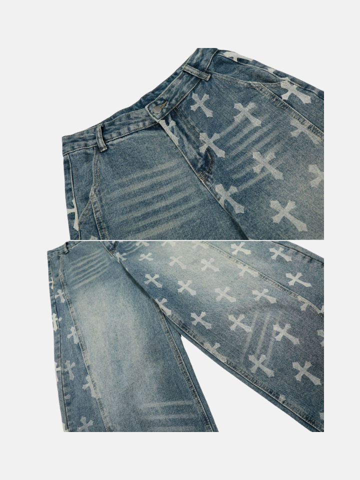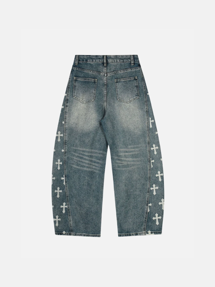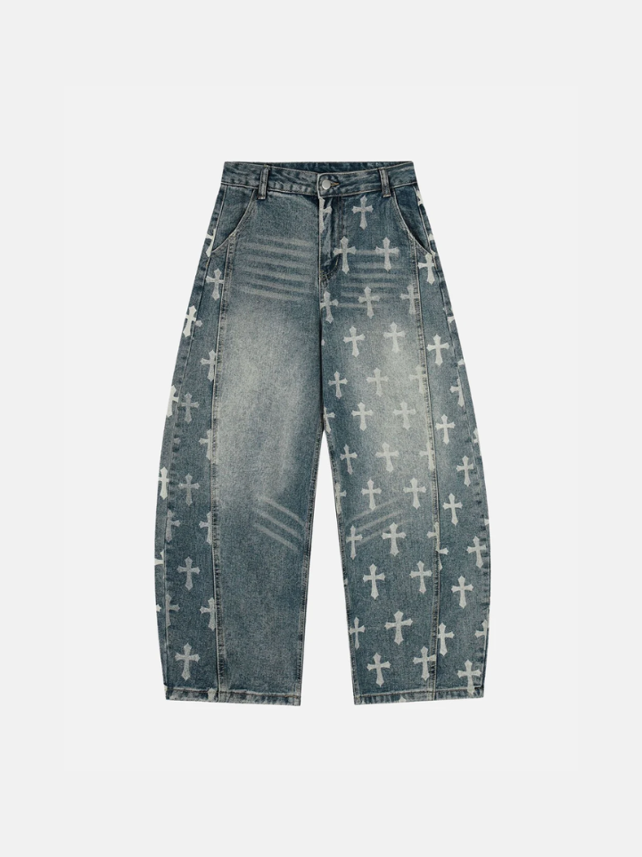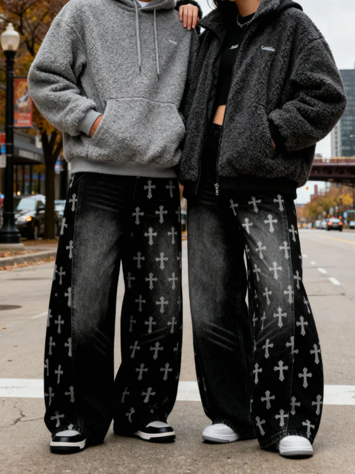 The Pants 'Hollowcrest' is a cross-motif baggy pants with the cross pattern integrated into the fabric surface — structural, symbolic, and committed to a specific visual language.